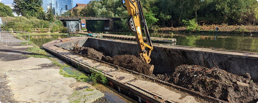 As a result, ECS were tasked with creating a bespoke solution to translocate the large quantities of soil to a location where they could be loaded into wagons for removal. ECS commissioned the help of a specialist barge company, with experience of working on the Brentford Locks, to ferry the soil across the canal, where it was then stockpiled for removal – the client had full control of the sites on both sides of the canal as part of the bridge construction.