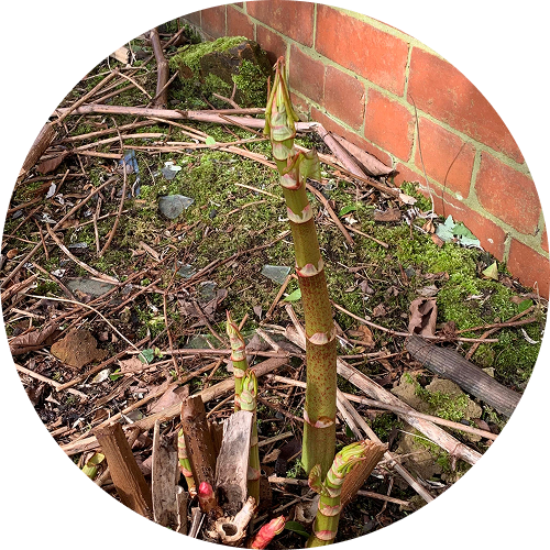 Look for pink or red buds at ground level. These develop into hollow, asparagus-like shoots that quickly grow into thick, bamboo-style shoots.